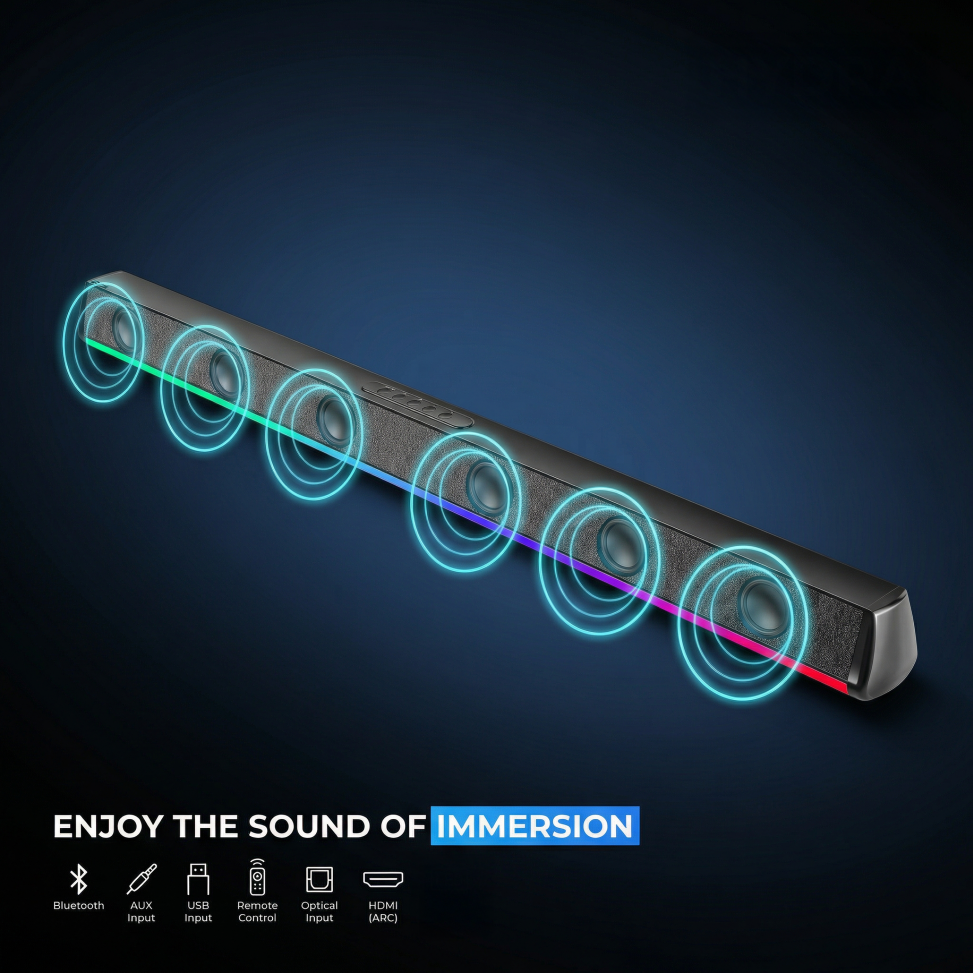 With multiple connectivity options including Bluetooth 5.0, HDMI ARC, AUX, USB, FM, and Coaxial input — BOOMBAR gives you complete flexibility and seamless performance.